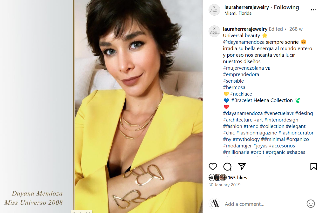 Miss Universe Dayana Mendoza loves the elegant and sophisticated designs of Laura Herrera Jewelry. Each piece perfectly complements her style, showcasing the beauty of both the jewelry and the wearer.