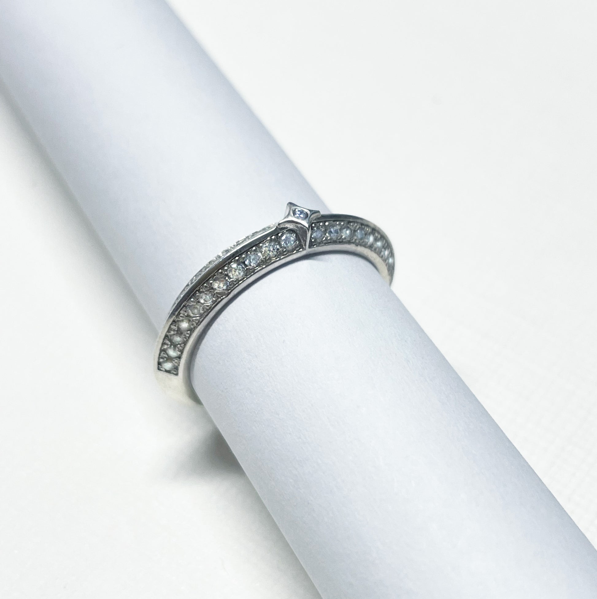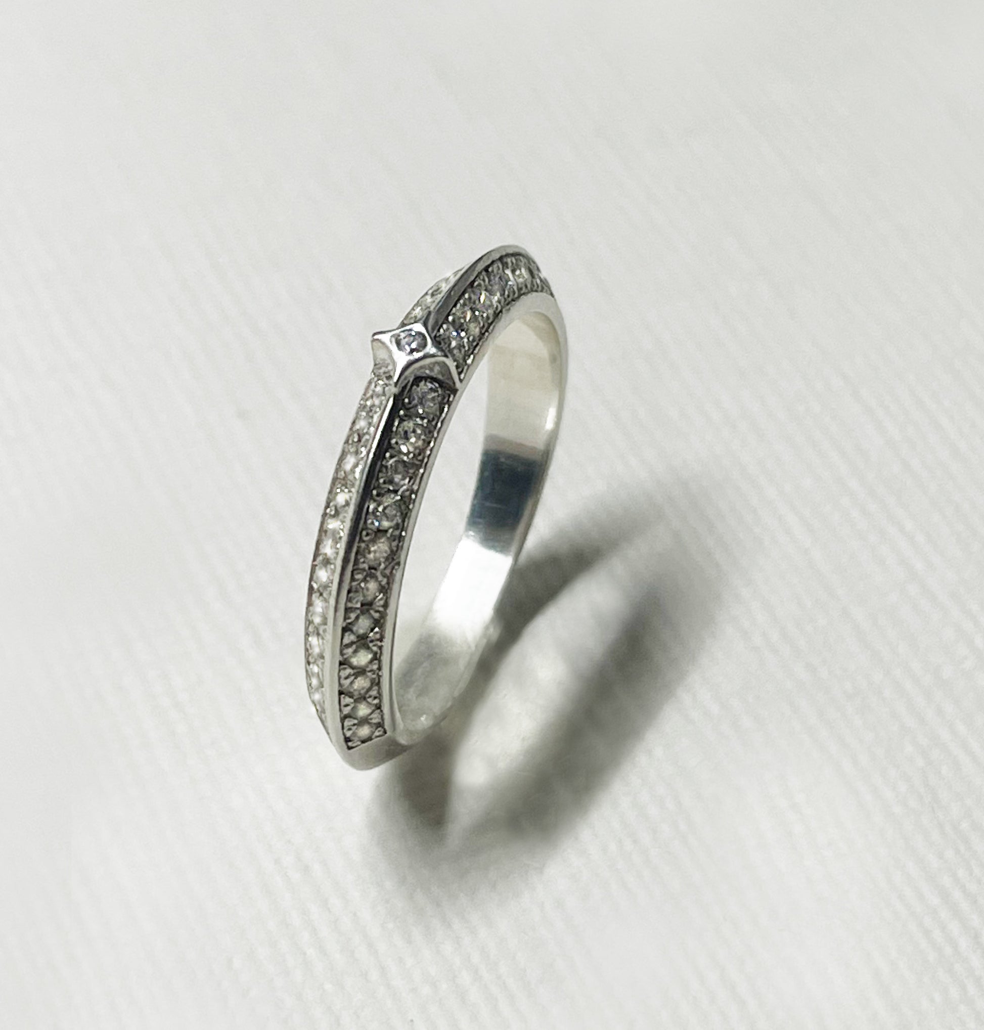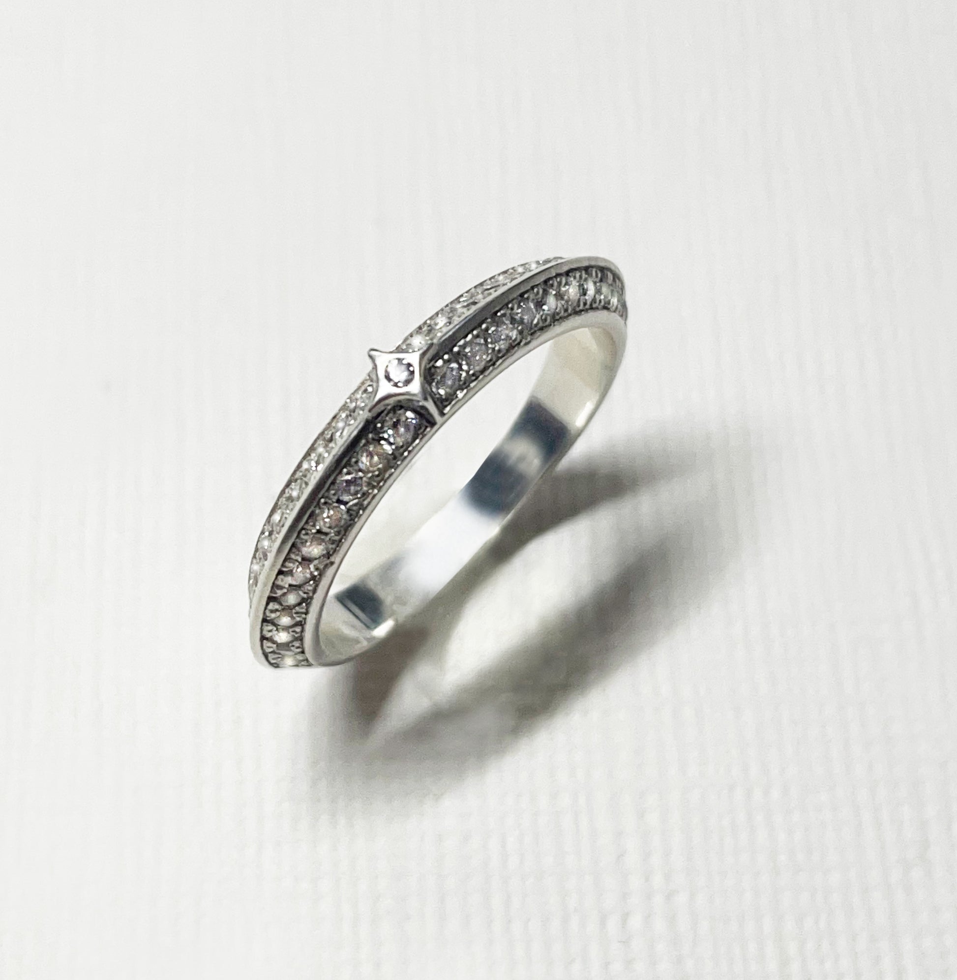 This ring from the ASTRAL Collection shines like a comet in the night sky. Its unique angular design features a double line of 4 groups of 11 diamonds each, creating a magical total of 44 Round Brilliant-Cut Diamonds of 1.3 mm that sparkle brilliantly. At the center, a star shape holds a 1.5 mm central diamond, symbolizing the eternal promise of love. A ring that captures the essence of the cosmos in an elegant and timeless design.
